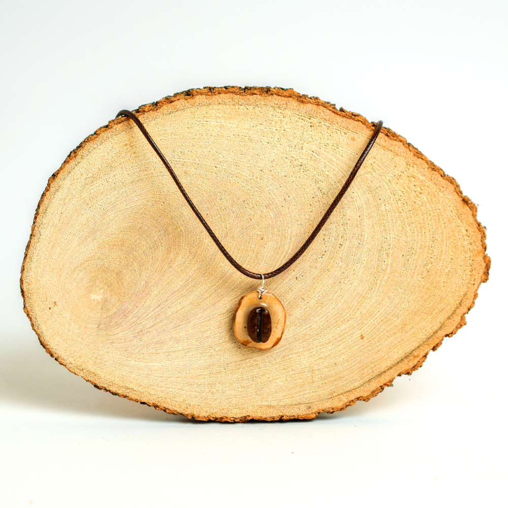Elaborado con dije de madera de café reciclada y un seleccionado grano de café tostado, encapsulado en resina. Tamaño regulable.