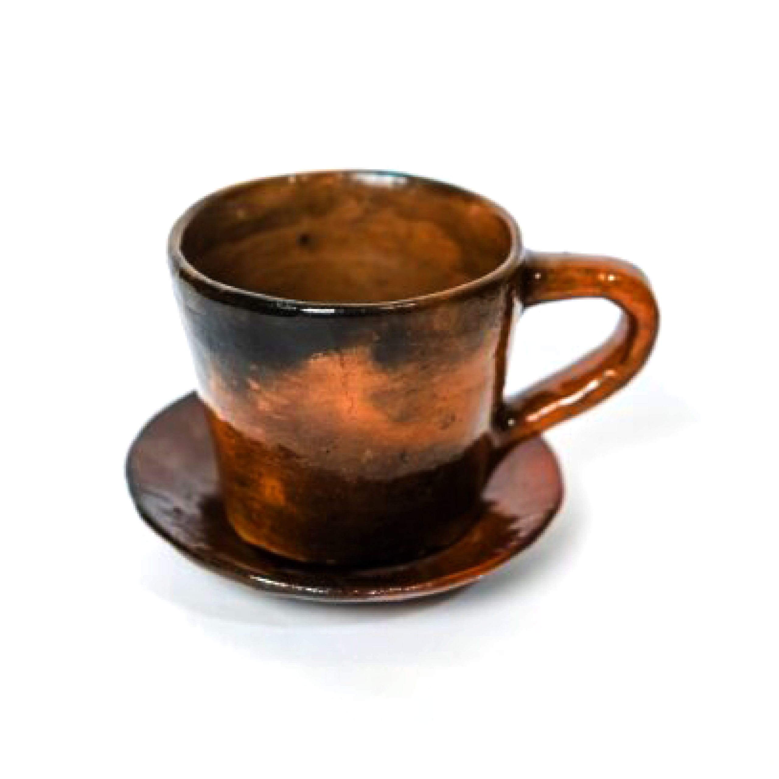 Taza y plato elaborado por madres ceramistas de la Comunidad Nativa Awajún de Supayaku en San Ignacio; utilizando arcilla, tintes naturales y resina natural de árboles nativos (yukaip). Dicha técnica ha sido reconocida por la UNESCO como Patrimonio Cultural Inmaterial de la Humanidad-2021. Tamaño aproximado: 8 x 8 cm.